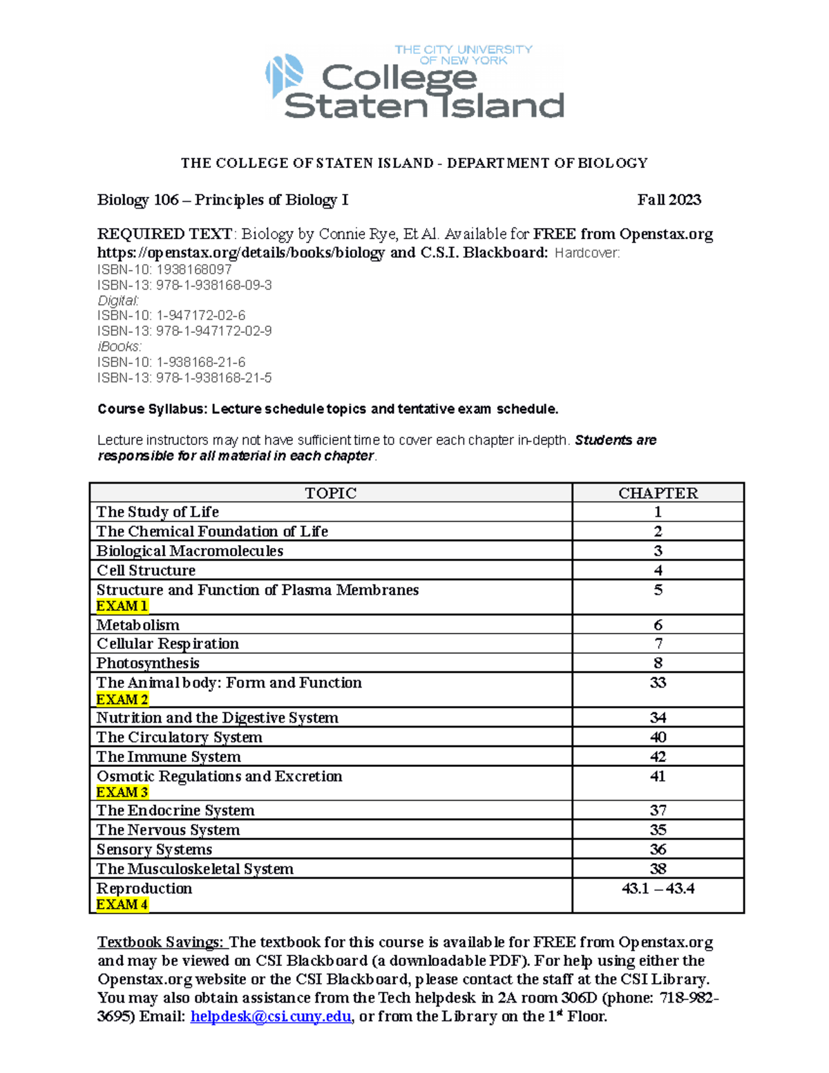 Biology 106 Principles of Biology I Fall 2023 (1) THE COLLEGE OF