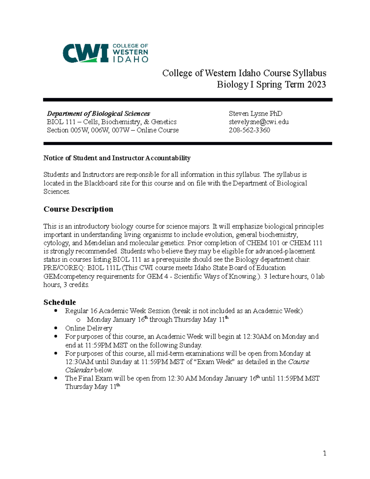 SP23 BIOL 111 005W006W007W Lysne College of Western Idaho Course