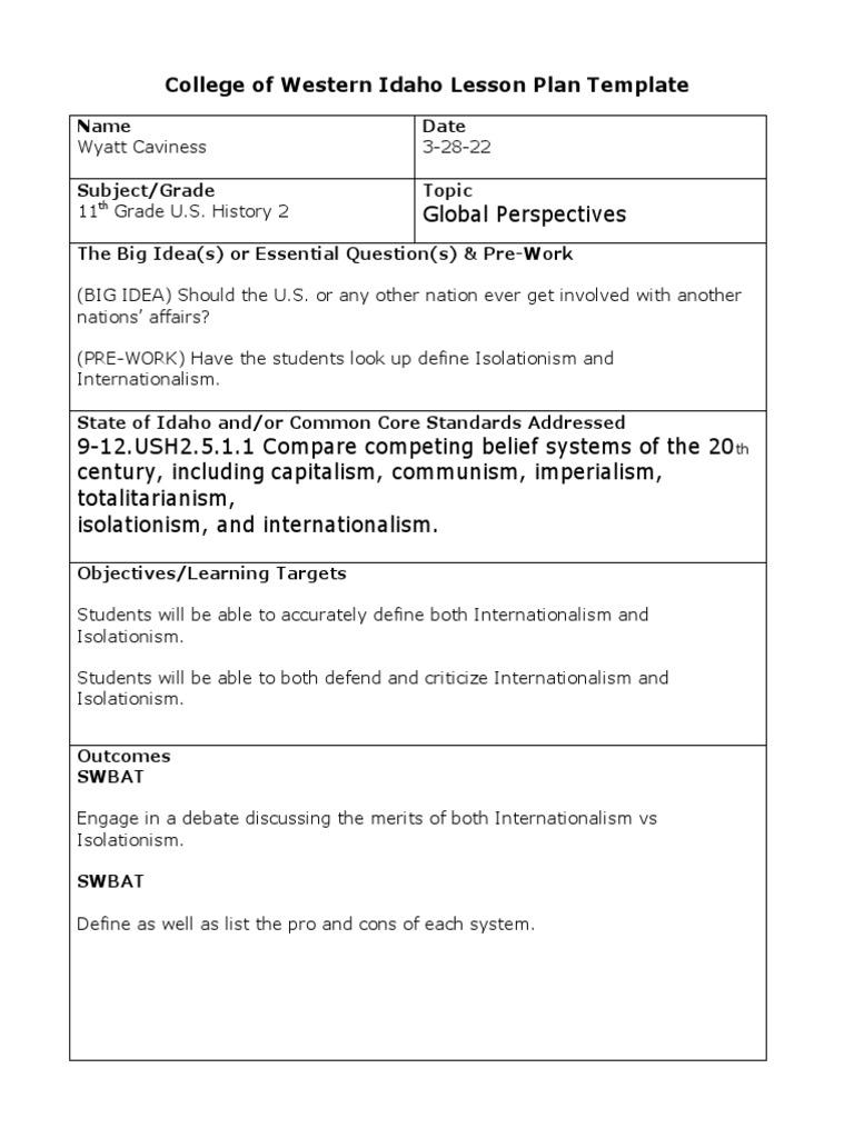 Global Perspectives College of Western Idaho Lesson Plan Template