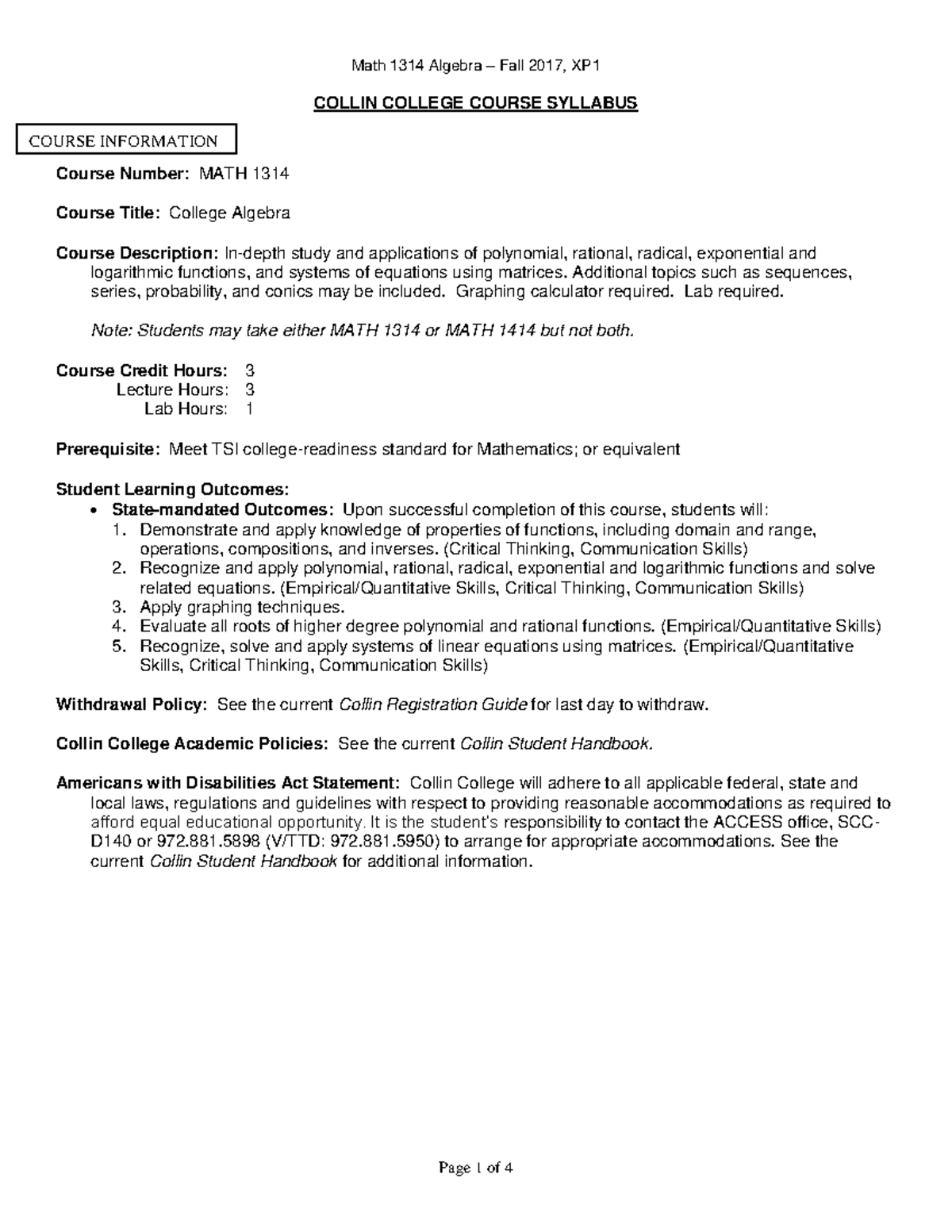 1314 Syllabus Fall 2017 XP1 COLLIN COLLEGE COURSE SYLLABUS Course