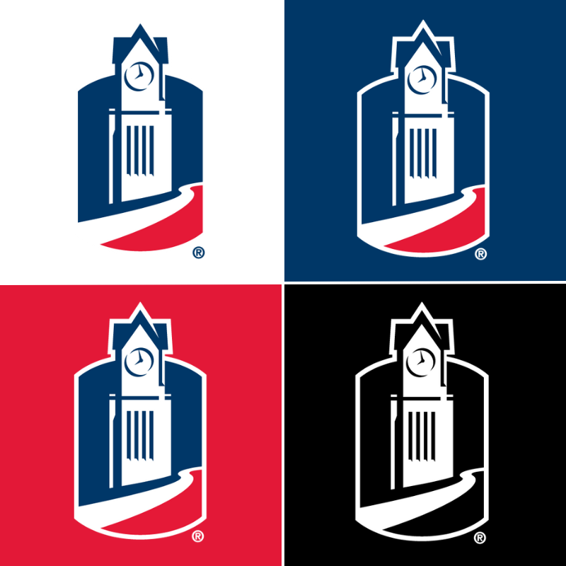 Columbus State University Clock Tower Icons on White, Blue, Red and