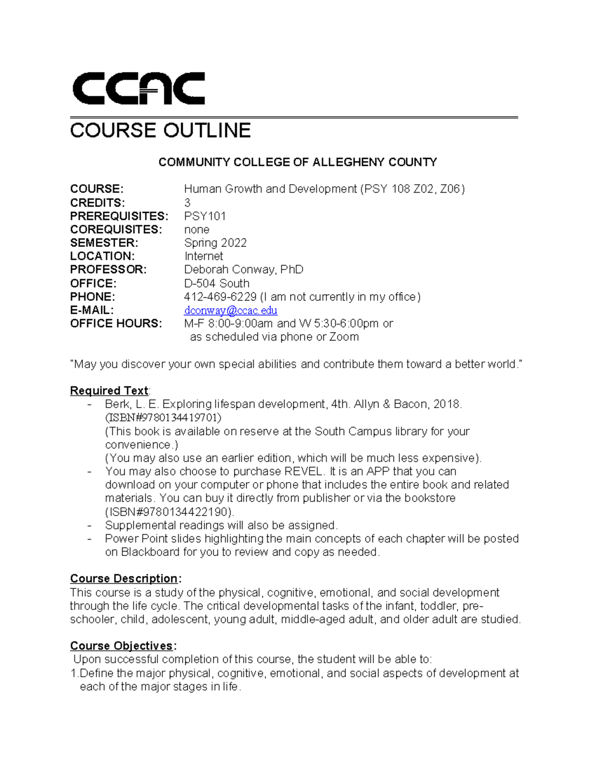 psy 108 syllabus COURSE OUTLINE COMMUNITY COLLEGE OF ALLEGHENY COUNTY