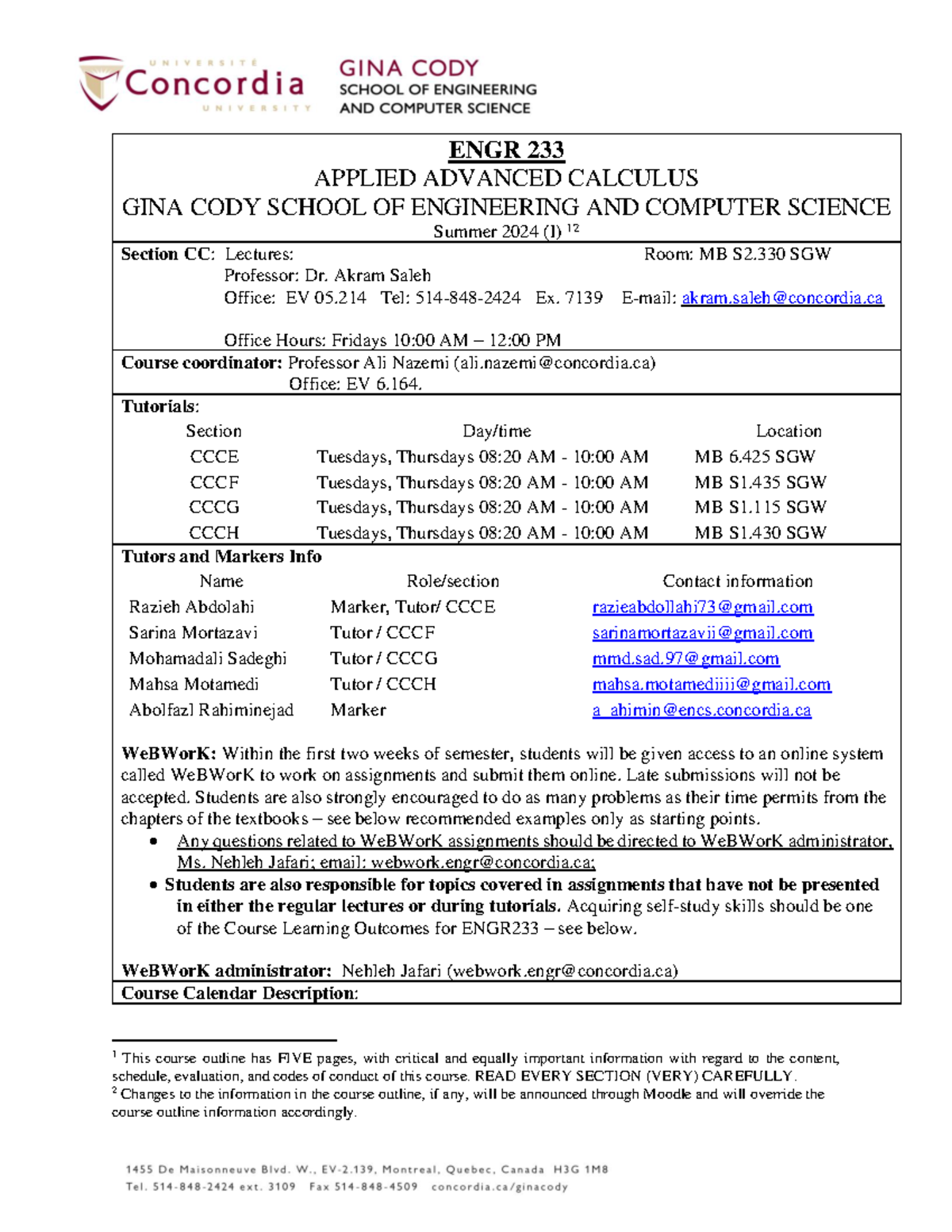 Concordia Course Outline ENGR 233 Summer II 2024 ( Applied Advanced
