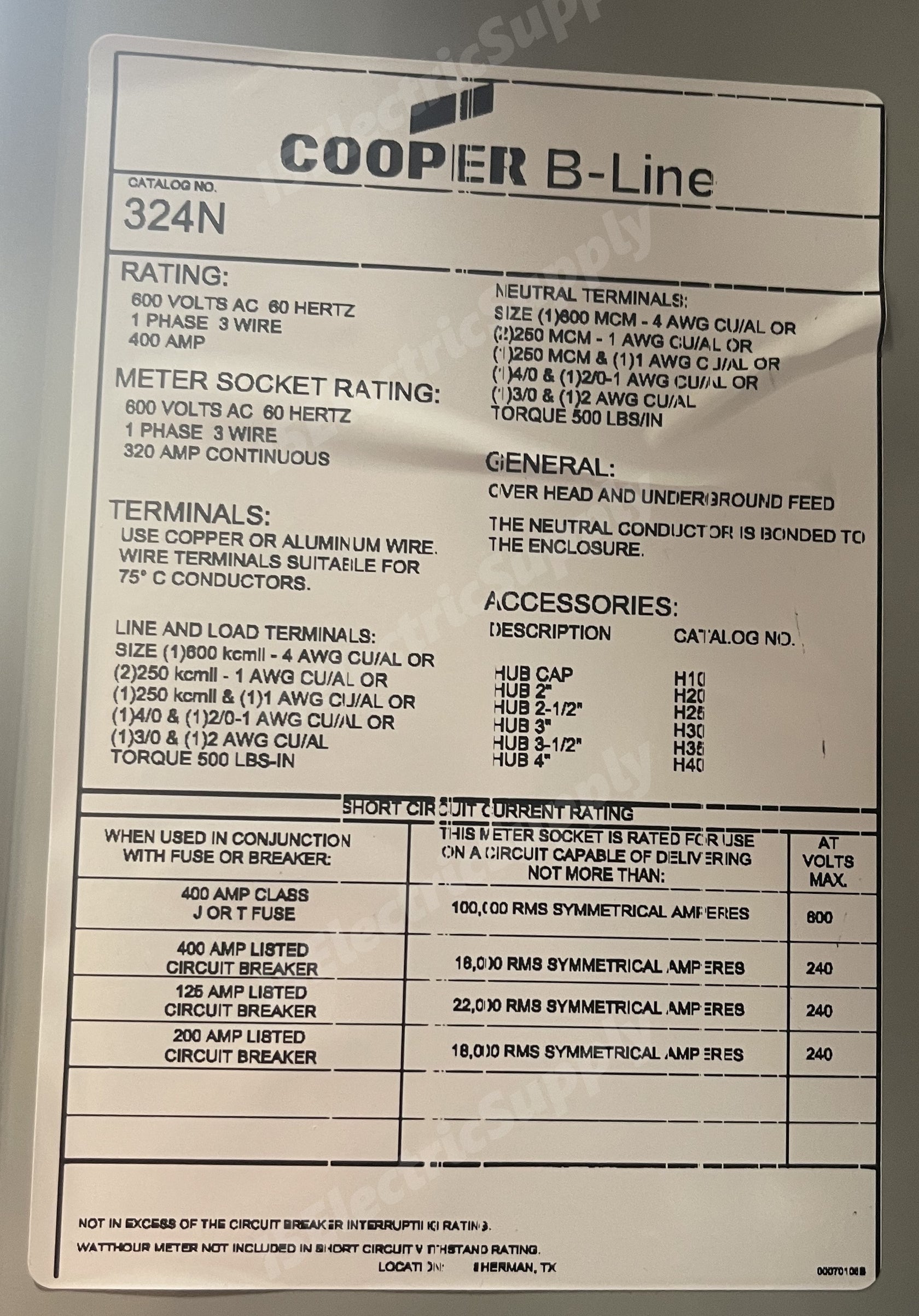 Eaton 400 / 320 Amp 324N Meter Base / Socket Bundled With 2 200A Main