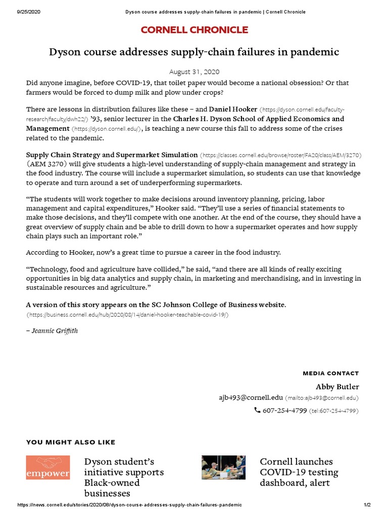 Dyson Course Addresses SupplyChain Failures in Pandemic Cornell