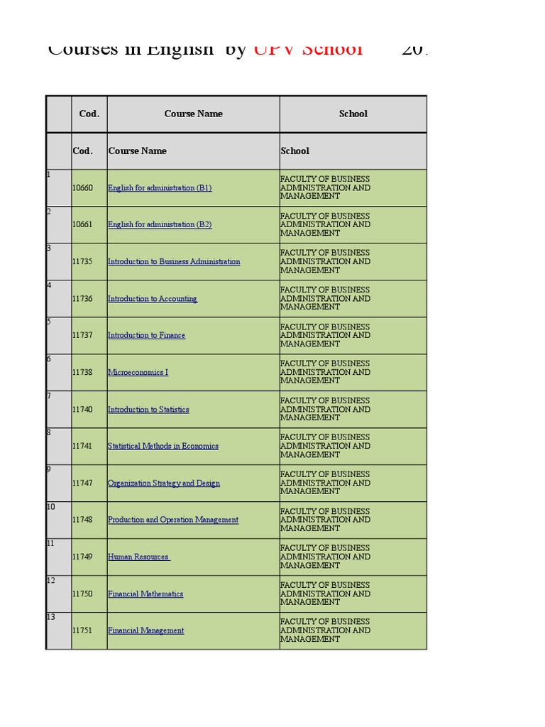 UPV School Course Catalog 2018/2019 Listing of English Language and