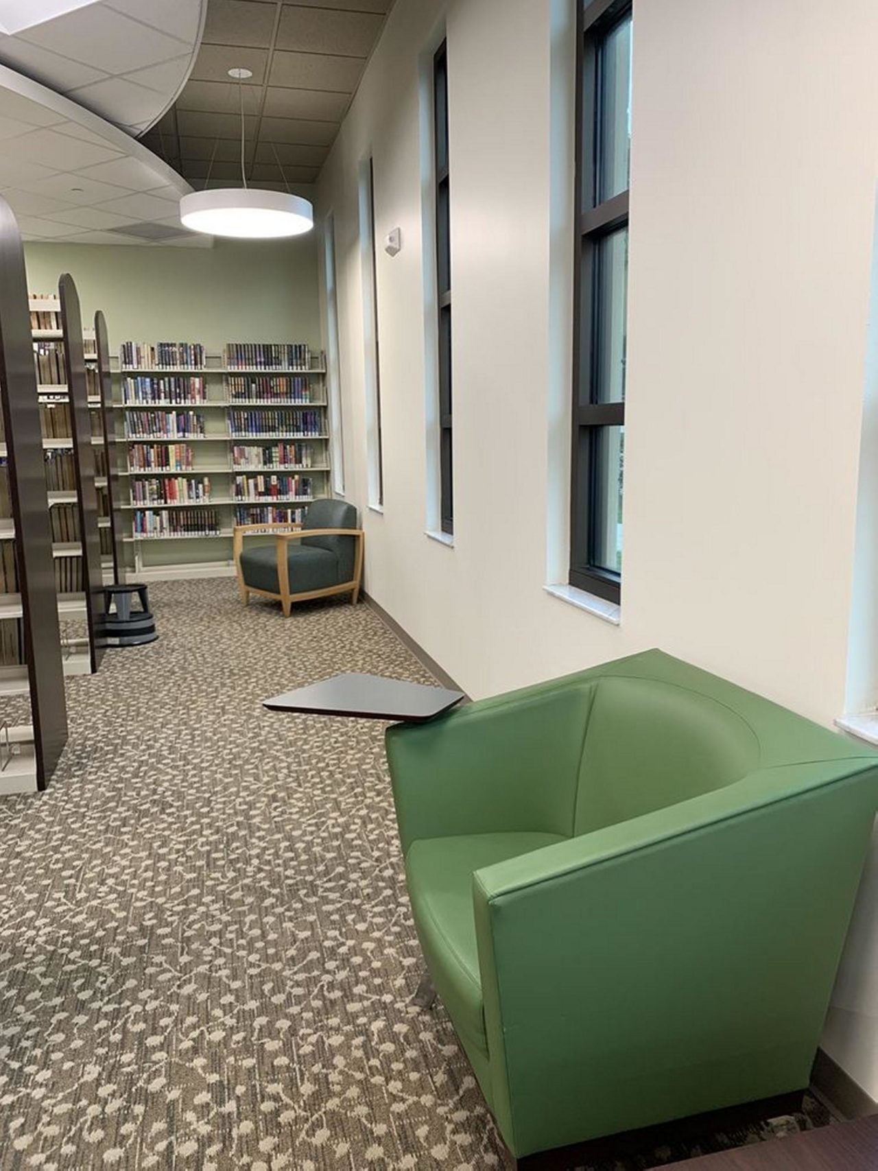 Library room interior with seats and coffee table side view window on