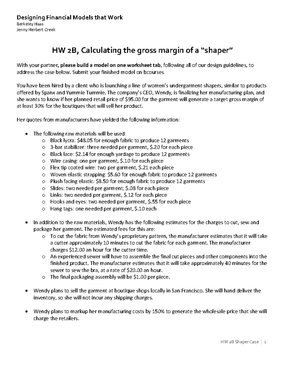 Class 2 Shaper Case for HW2 Designing Financial Models that Work