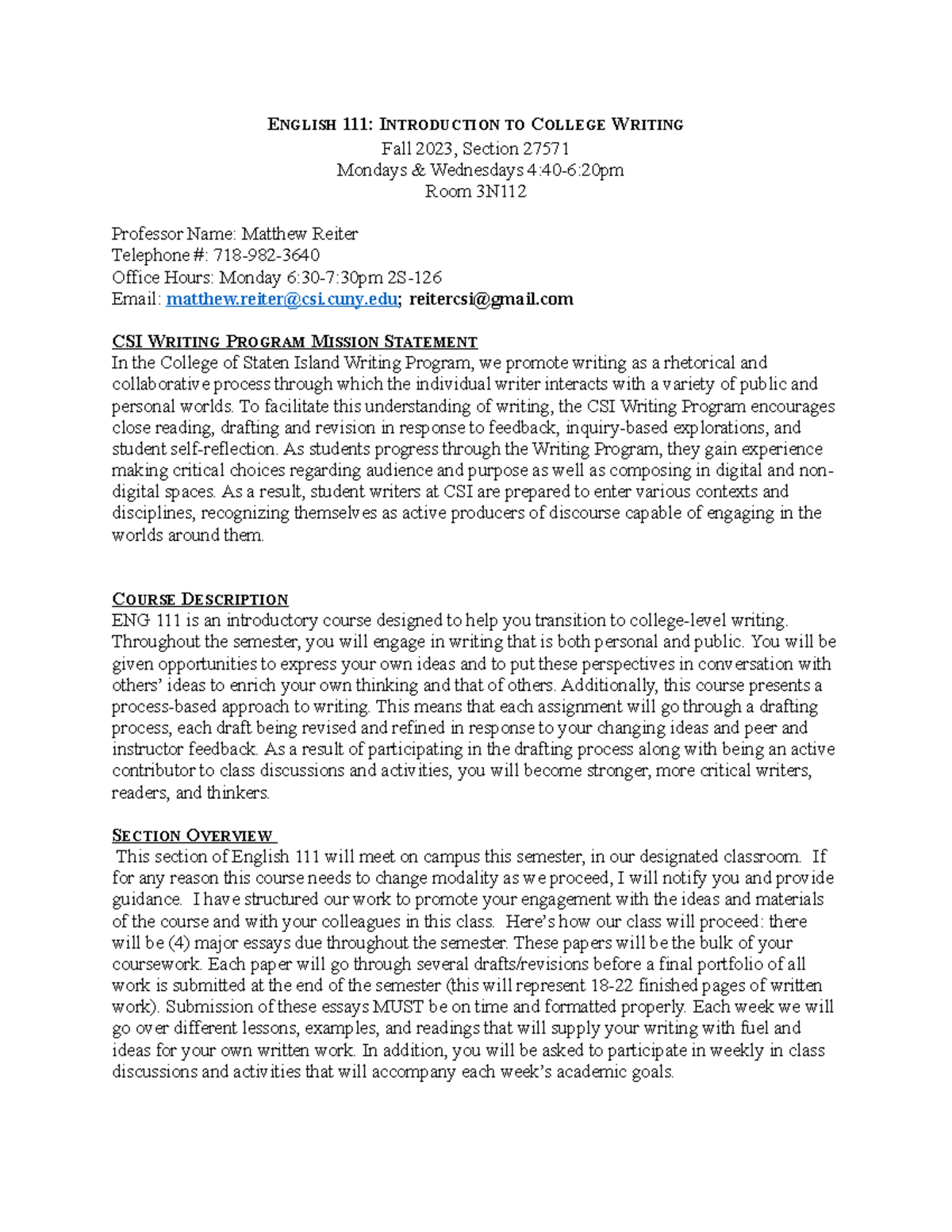 English 111 Sec 27571 Fall 2023 MW Syllabus ENGLISH 111 INTRODUCTION