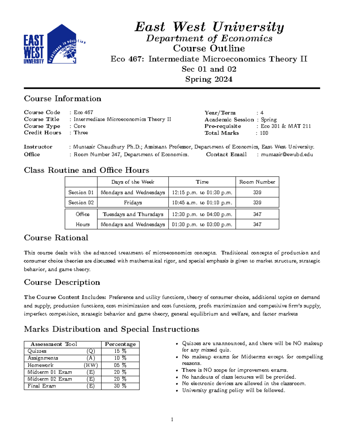 Course Outline Eco 467 (01 and 02) Spring 2024 EWU East West