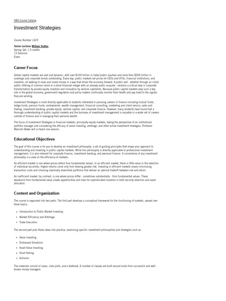 Investment Strategies Course Catalog Harvard PDF Investing