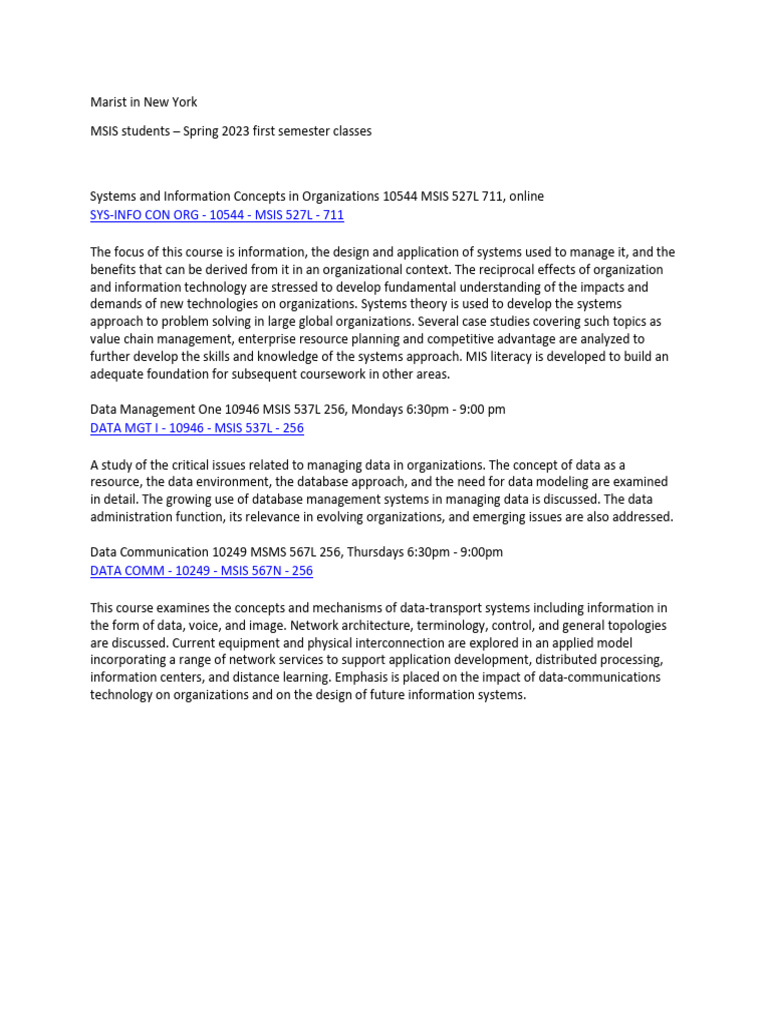Marist MSIS Spring 2023 First Semester Courses PDF