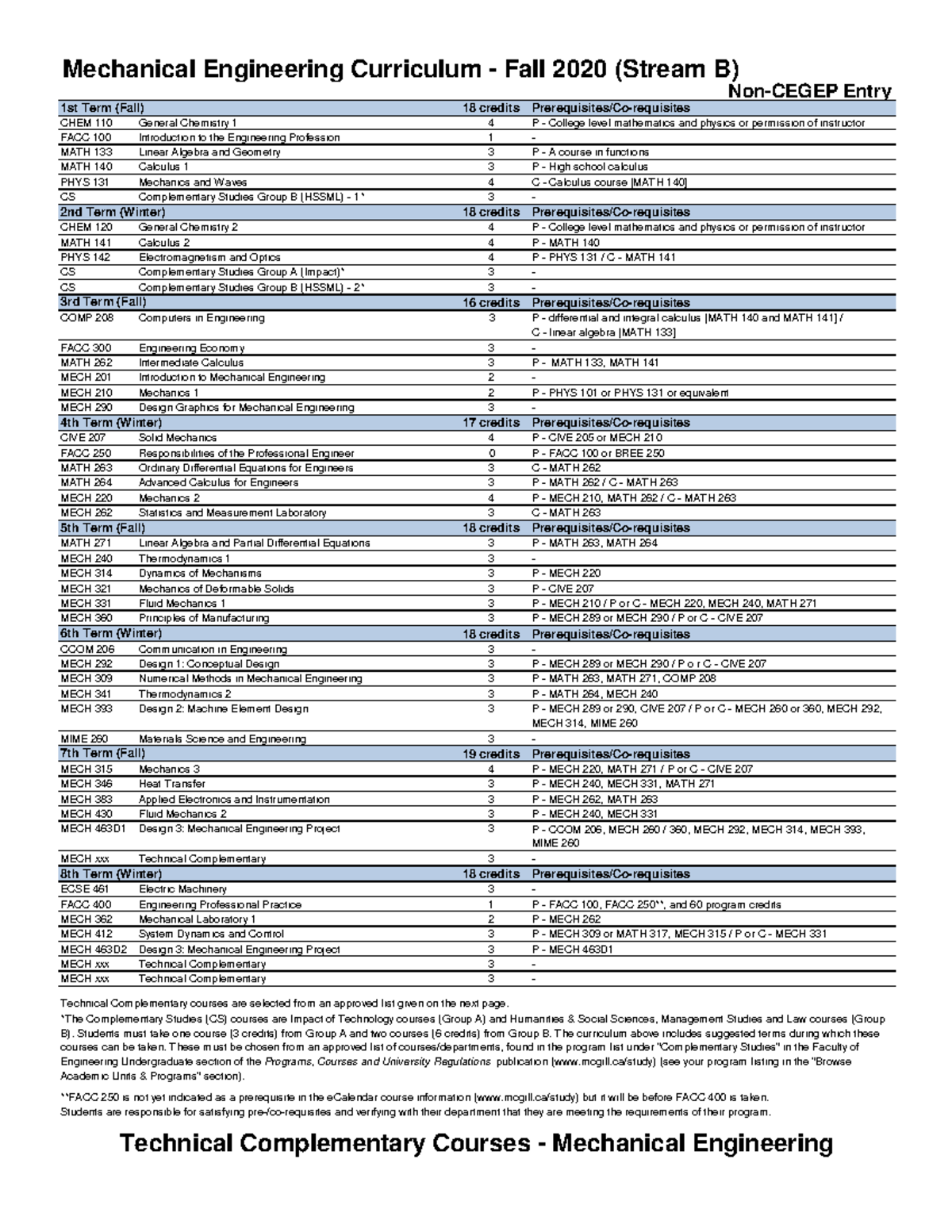 Mcgill mech eng courses NonCEGEP Entry 18 credits Prerequisites/Co