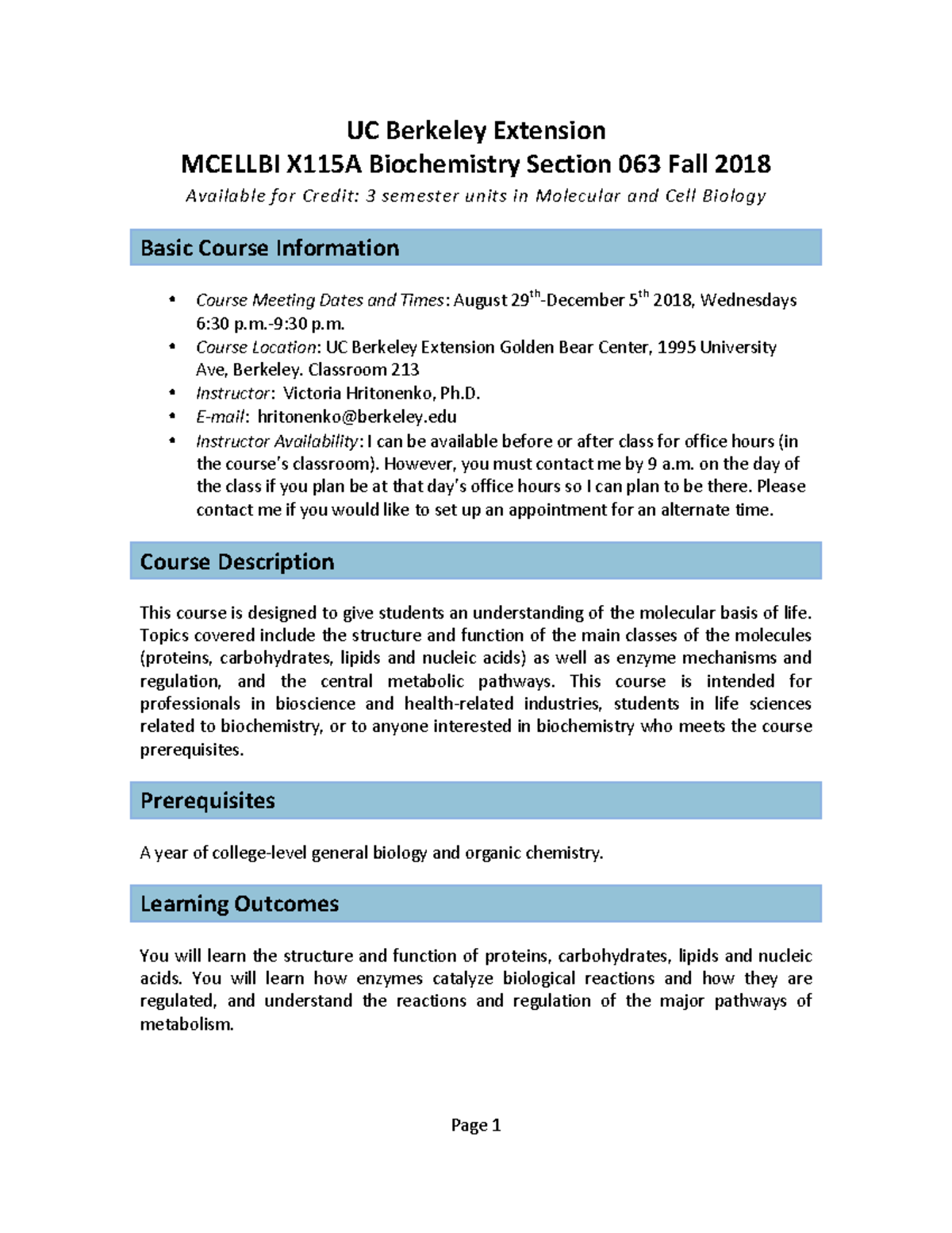 2018 7 23 Syllabus Biochemistry UC Berkeley Extension MCELLBI X115A