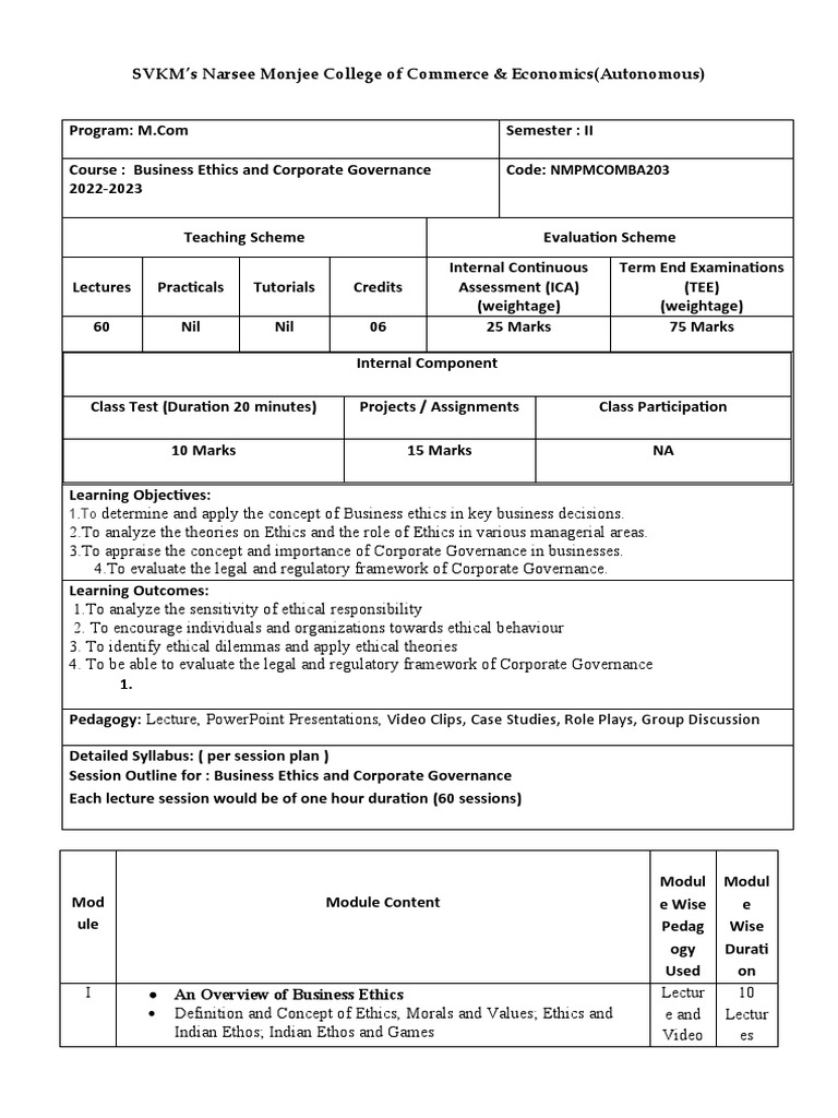 202 Part 1 Sem I Syllabus Business Ethics and Corporate Governance