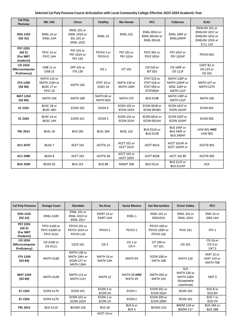 CPP Course Articulation With Local CC 2023 2024 PDF