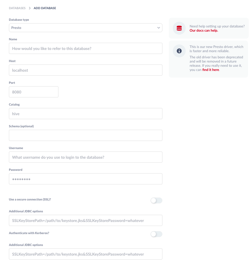 ![[Add Database > Presto] Multiple JDBC field options · Issue 18351](https://user-images.githubusercontent.com/31325167/136593088-1f1867d8-0546-44e9-a77b-b33e5ebce34c.png)