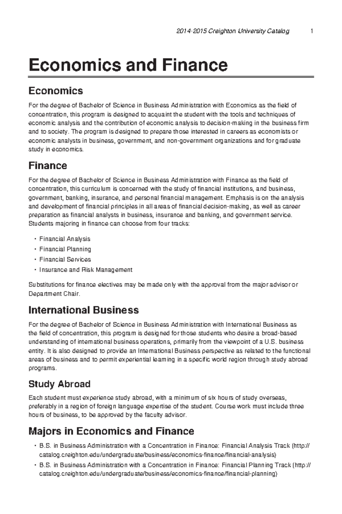 Finance notes 20142015 Creighton University Catalog 1 Economics