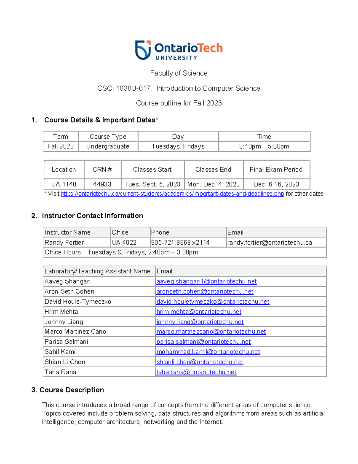 Course Outline F2023 CSCI1030U Section 017 CRN44933 Faculty of