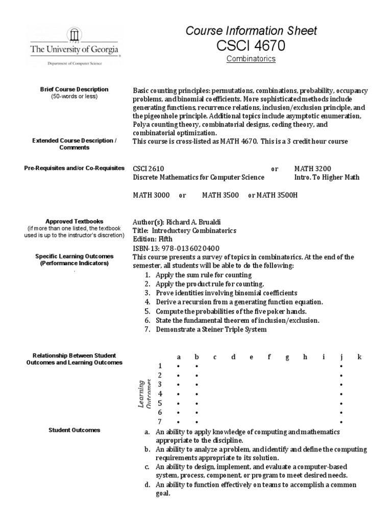CSCI 4670 Course Information Sheet PDF Combinatorics Discrete