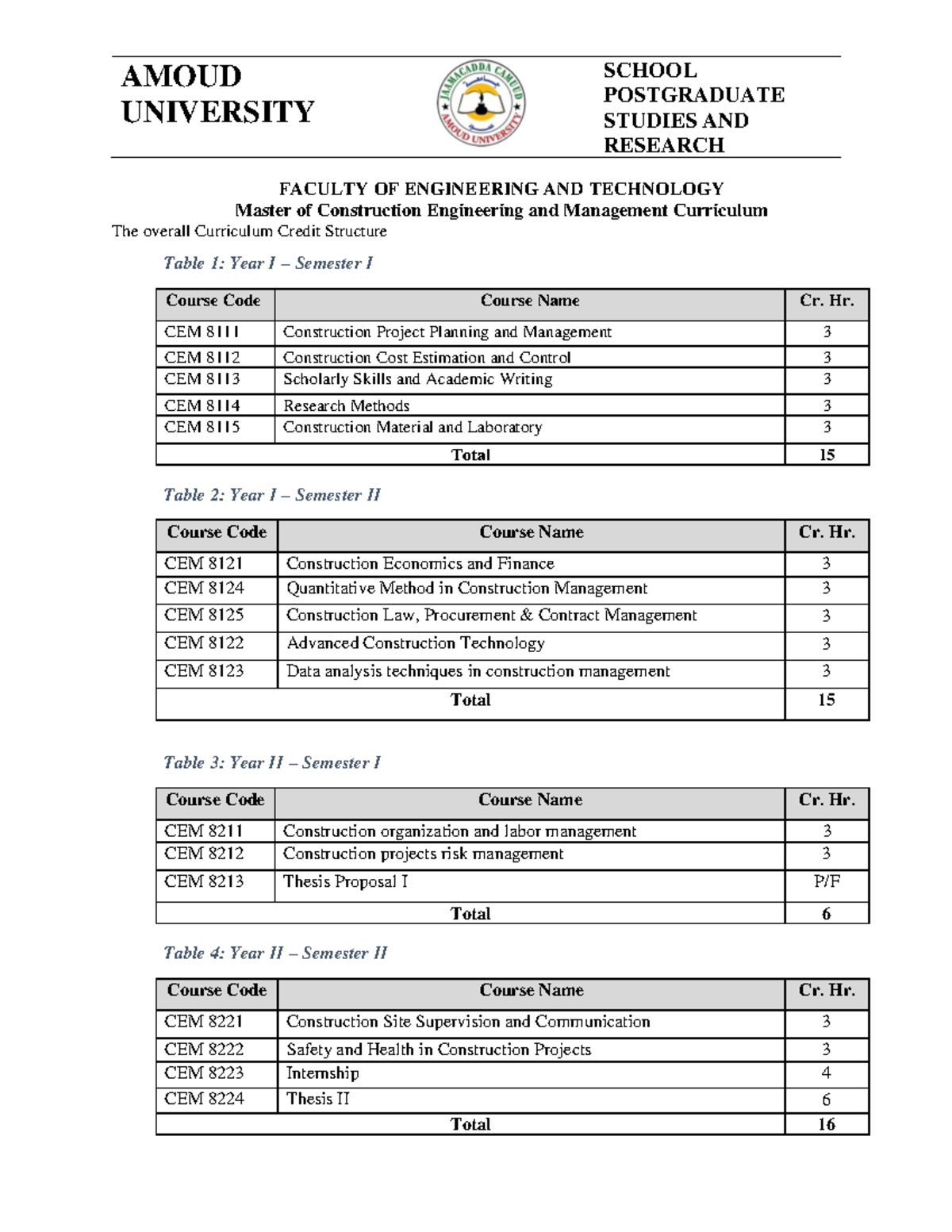 Master’S OF Science IN Construction Management Curriculum AMOUD