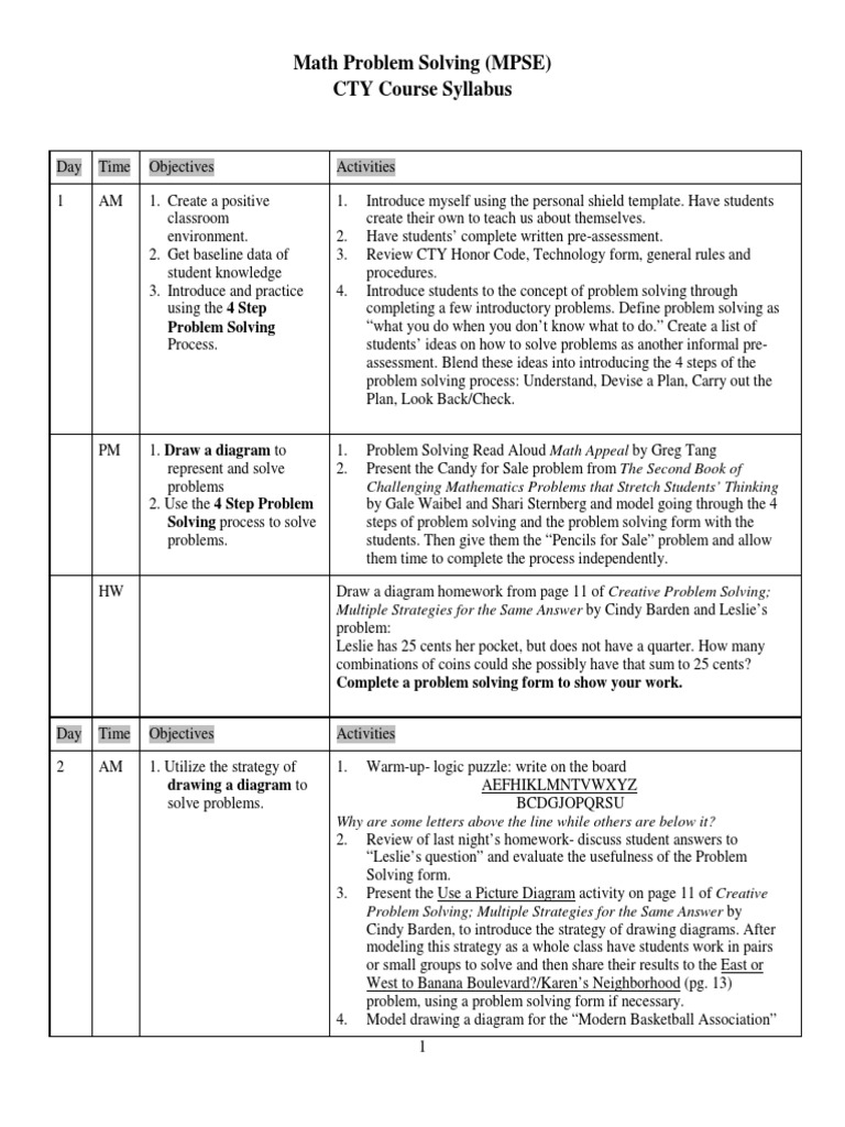 Math Problem Solving (MPSE) CTY Course Syllabus PDF Cipher Numbers