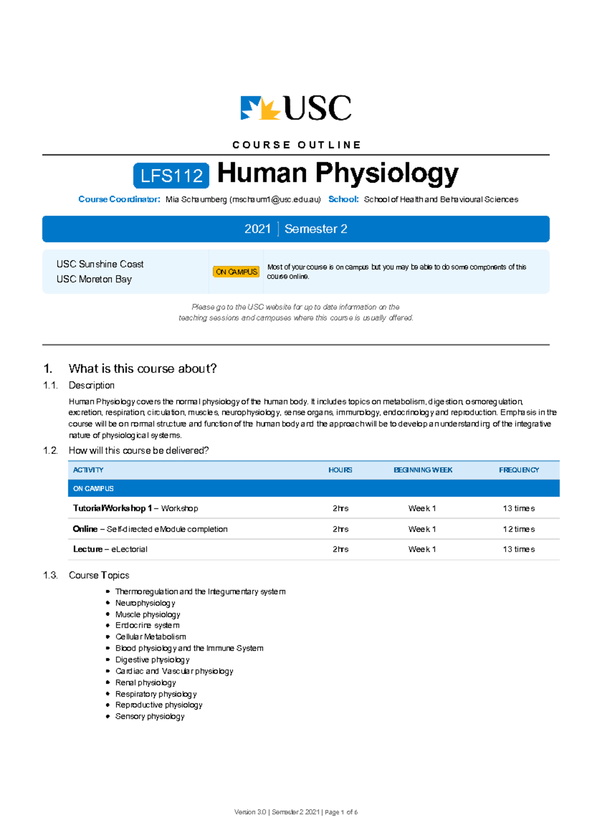 Physiology course outline semester 2 2021 C O U R S E O U T L I N E