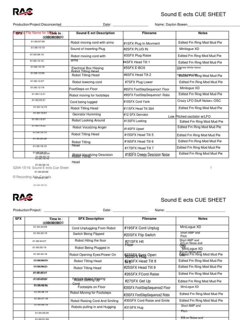 SFX Cue Sheets PDF
