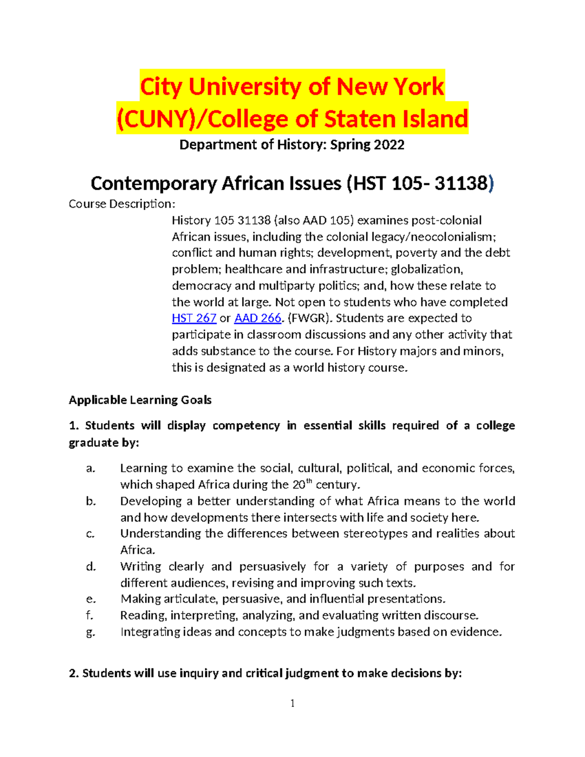 HSTAAD 105 NEW SYLL Good Notes City University of New York (CUNY