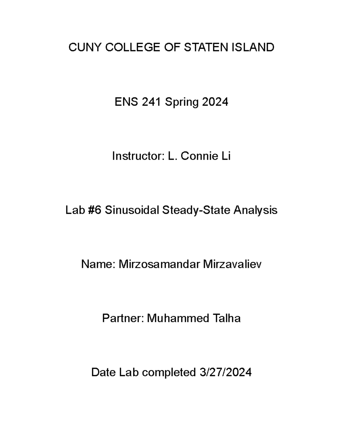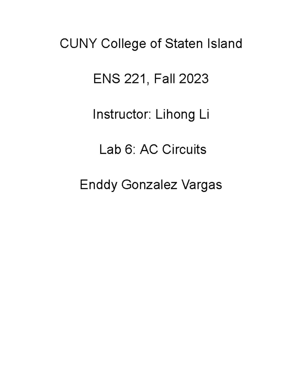Lab6 AC Circuits ENS 241 CUNY College of Staten Island ENS 221, Fall