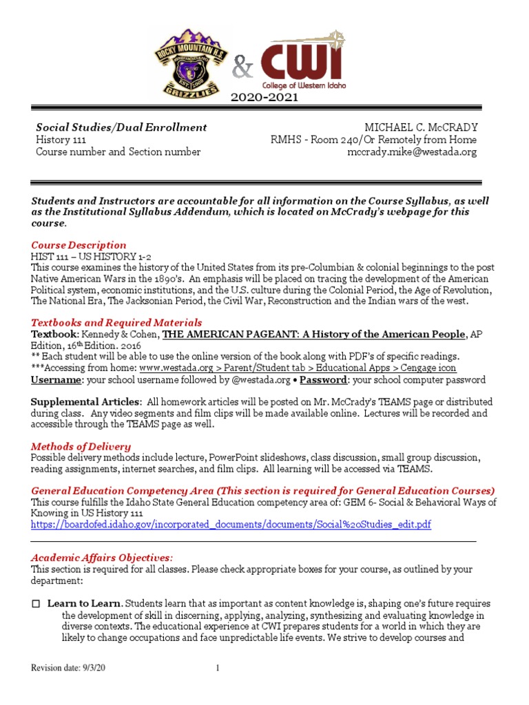 202021 CWI Course SyllabusMcCrady Hist 111 PDF Experience