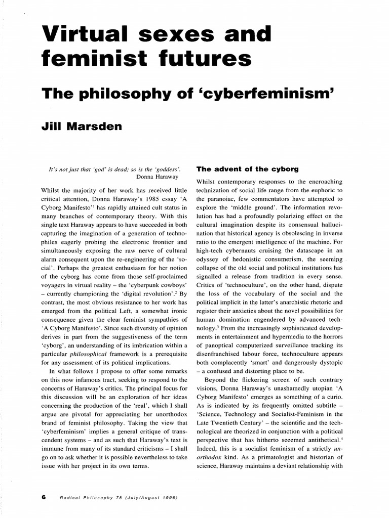 Virtual Sexes and Feminist Futures The Philosophy of 'Cyberfeminism