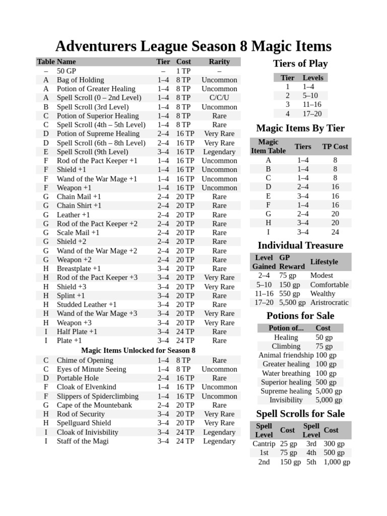 Printable List of Adventurers League Season 8 Magic Items dndnext