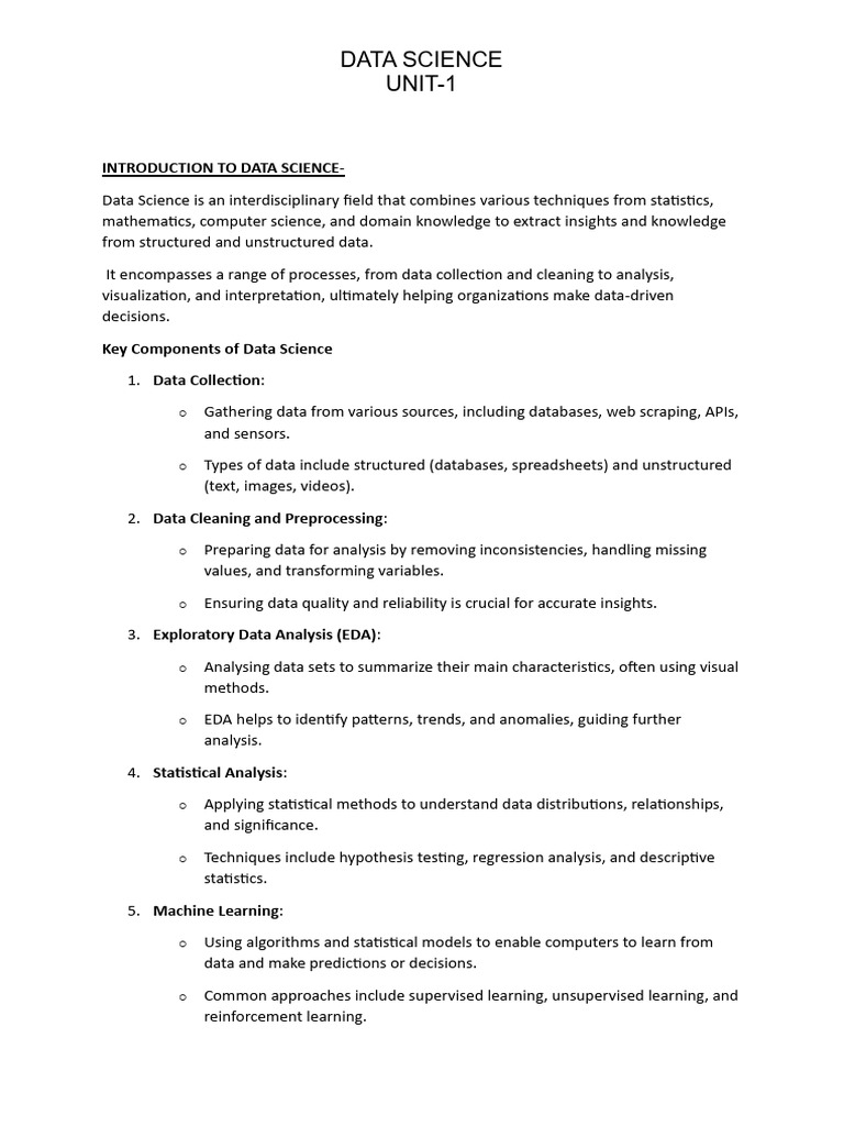 Data Science Unit1 notes PDF Data Science Data Analysis