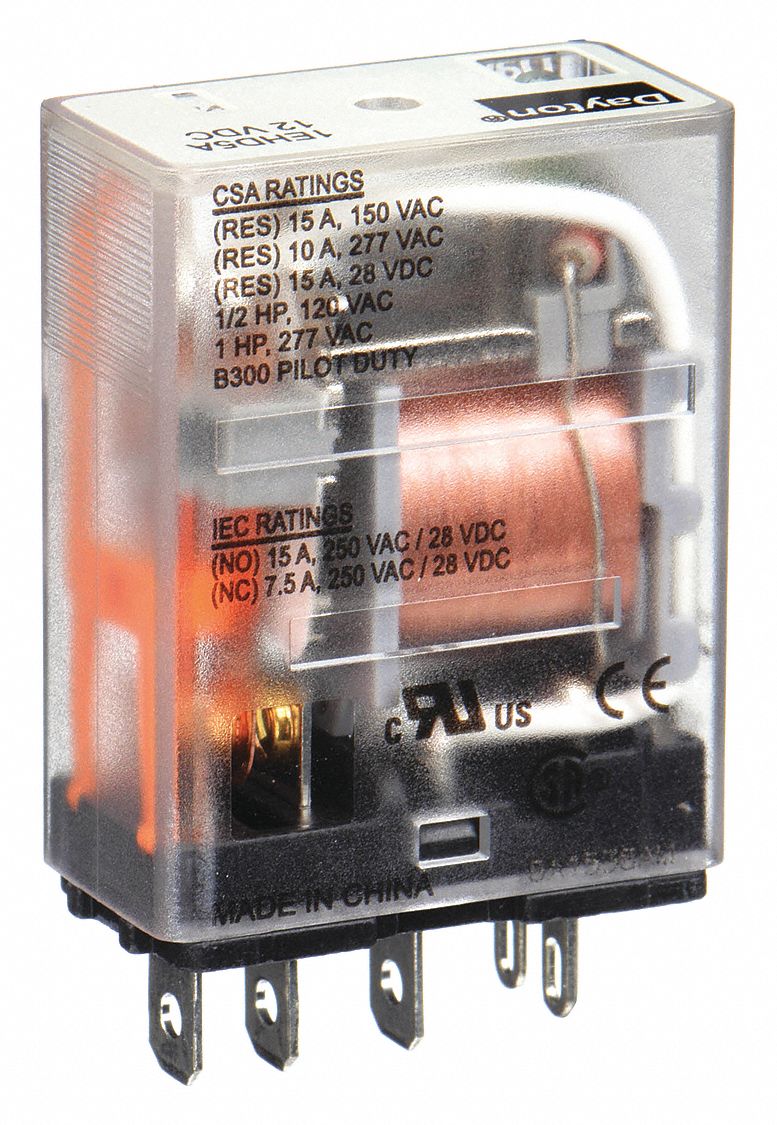 DAYTON General Purpose Relay, 12V DC Coil Volts, 15A 240V AC Contact