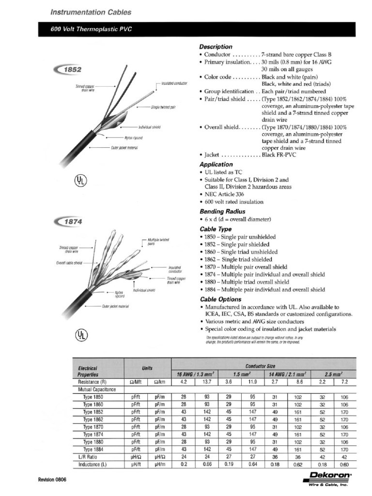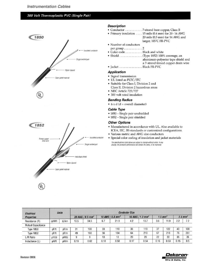 Dekoron Cable Product Specification Sheet Download Free PDF Wire