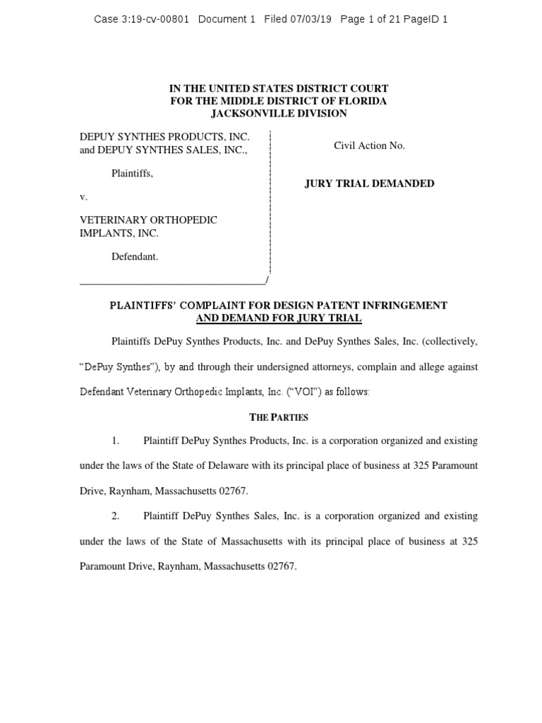 Depuy Synthes Prods. v. Veterinary Orthopedic Implants Complaint