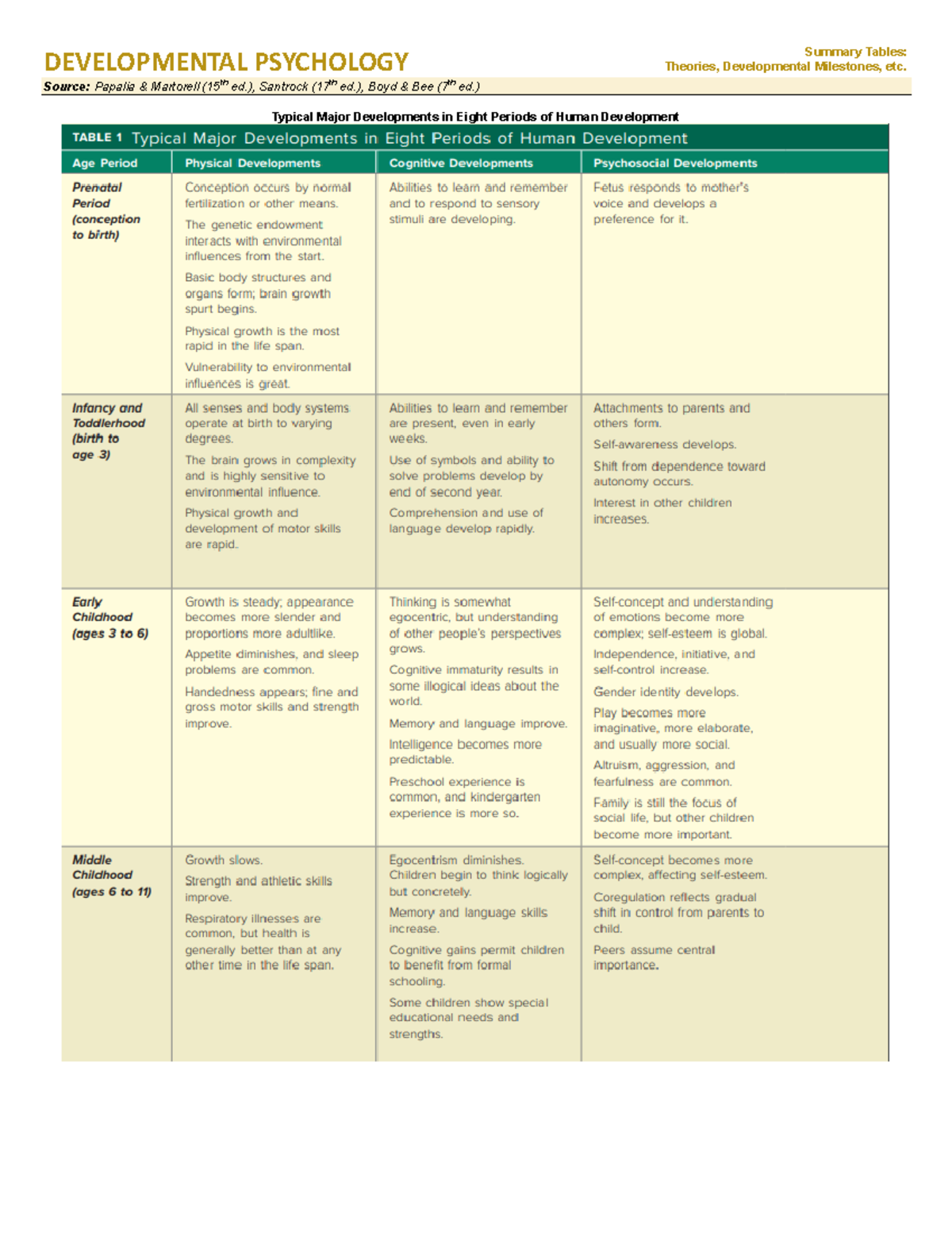 Devpsych Tables Notes DEVELOPMENTAL PSYCHOLOGY Summary Tables