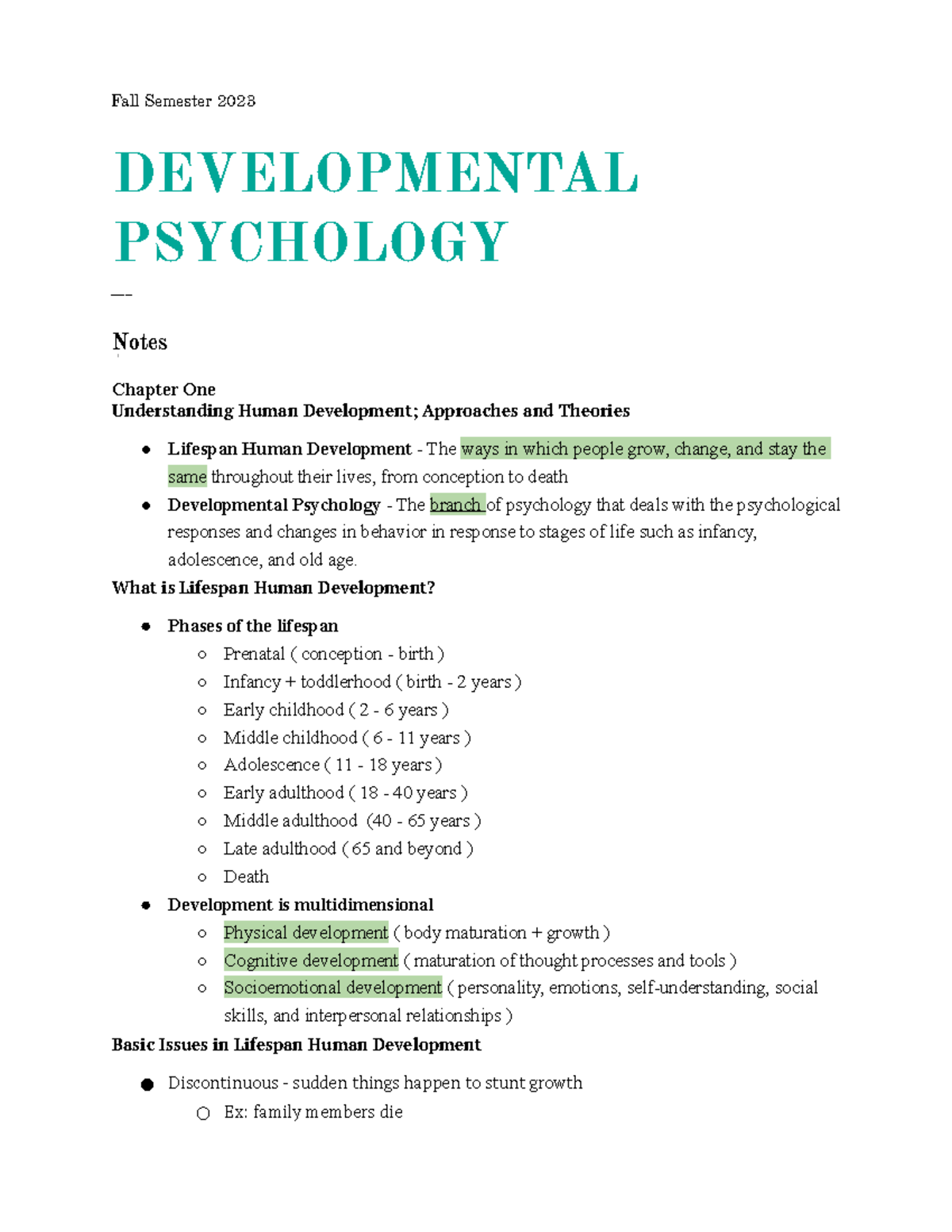 Class notes Fall Semester 2023 DEVELOPMENTAL PSYCHOLOGY ___ Notes