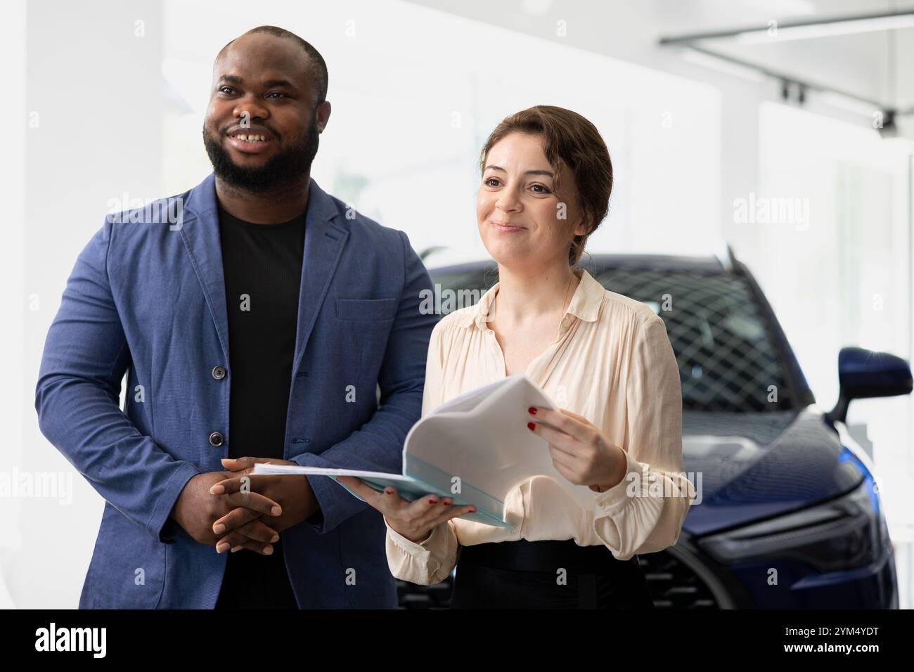 Customer in Car Showroom Browsing Automobiles Catalog on Tablet Stock
