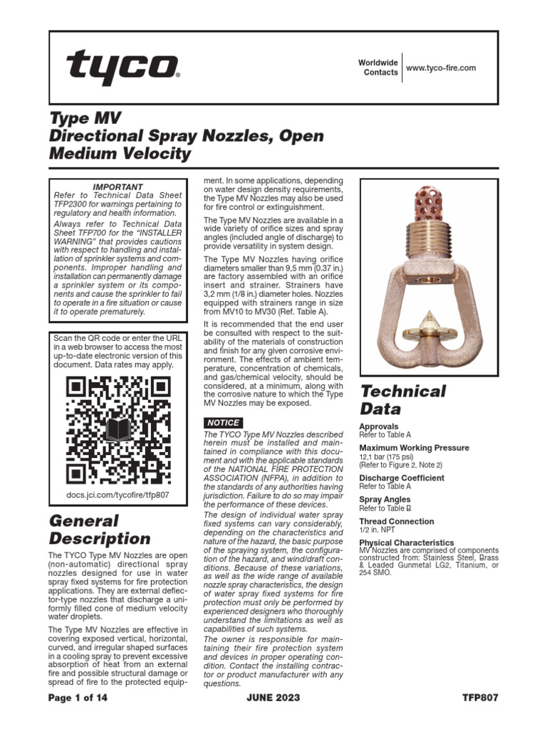 01 Tyco Data Sheet, Type MV Directional Spray Nozzles, Open Medium