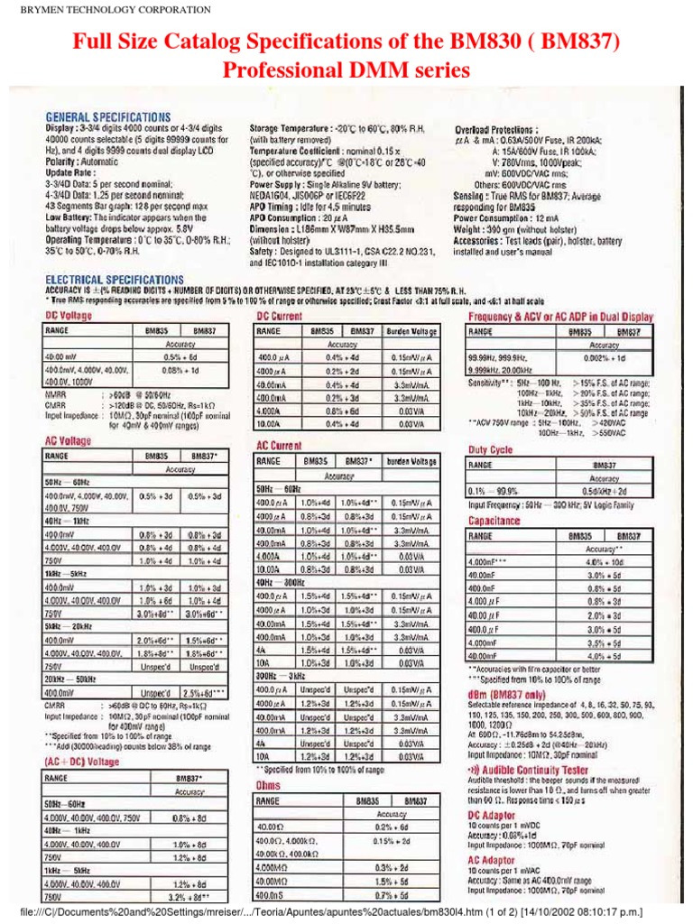 Full Size Catalog Specifications of The BM830 (BM837) Professional DMM