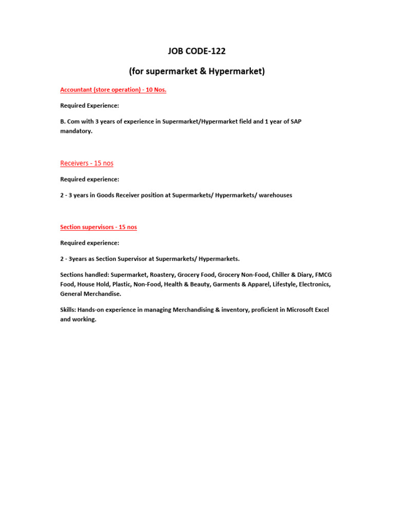 Job Code & Job Details PDF Supermarket Grocery Store