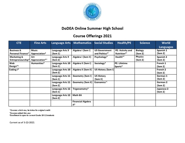 Dodea Online Summer High School Course Offerings 2021 PDF Science