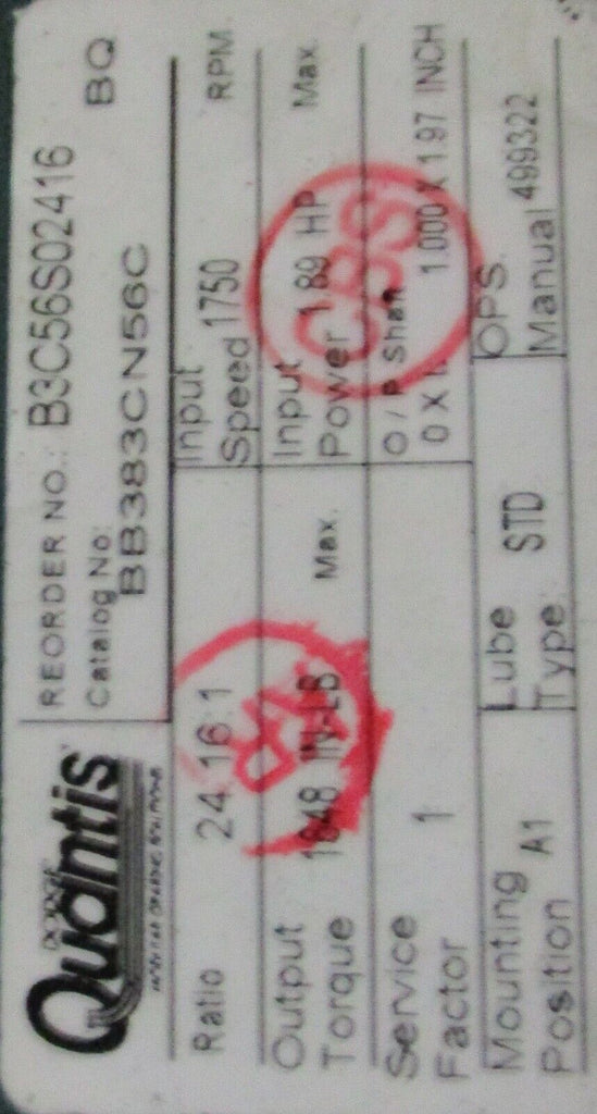 Dodge Quantis BB383CN56C Right Angle Gearbox 1750RPM 2.02HP 11/4" Bor