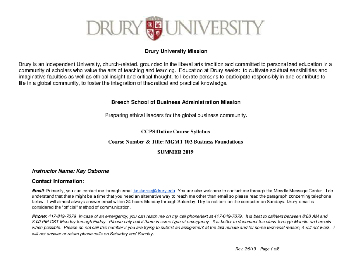 Business Foundations Syllabus Summer 2019 Online PDF Drury University