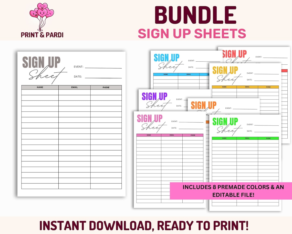 Editable Sign up Sheet Template, Printable Sign in Sheet Bundle