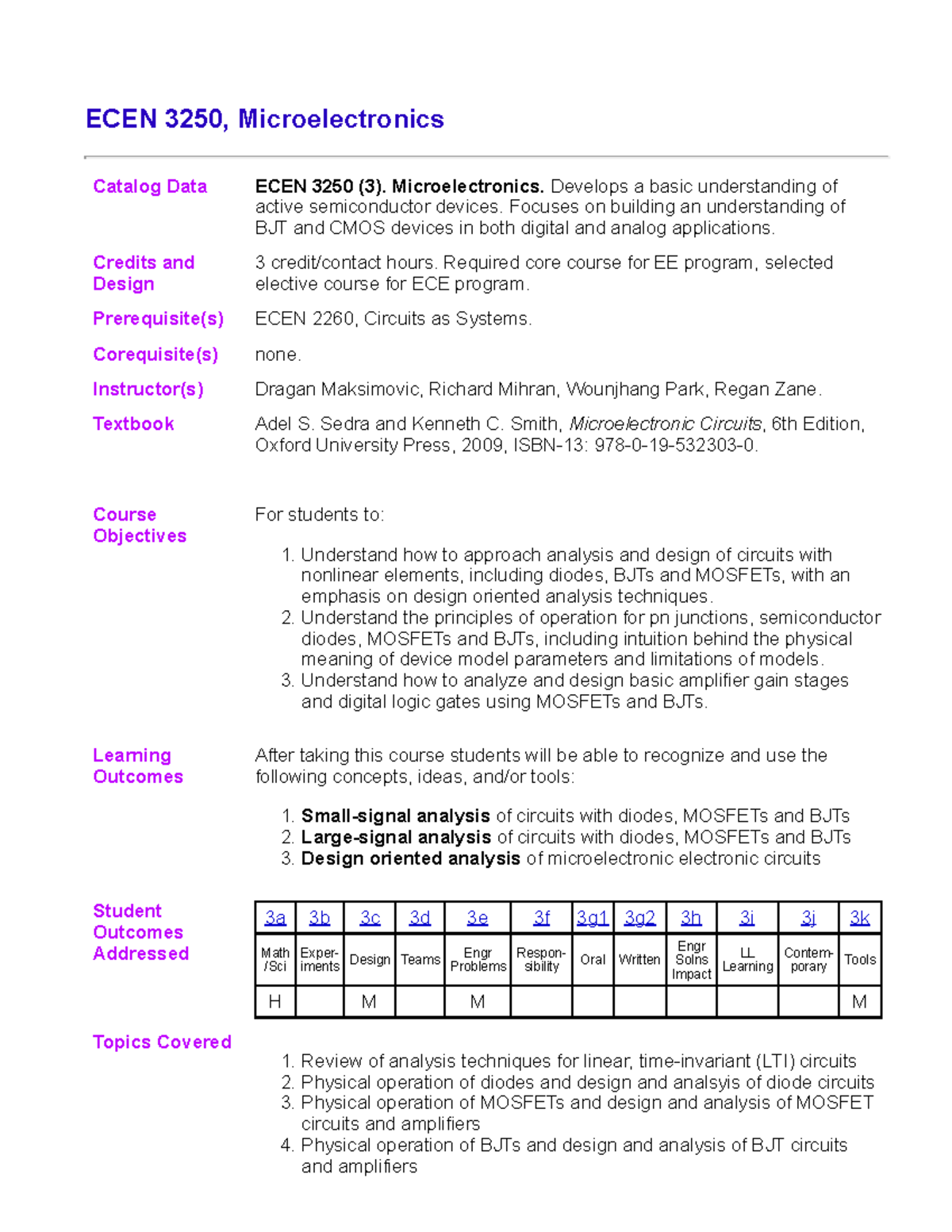 ECEN 3250, Microelectronics, Course Syllabus8 ECEN 3250