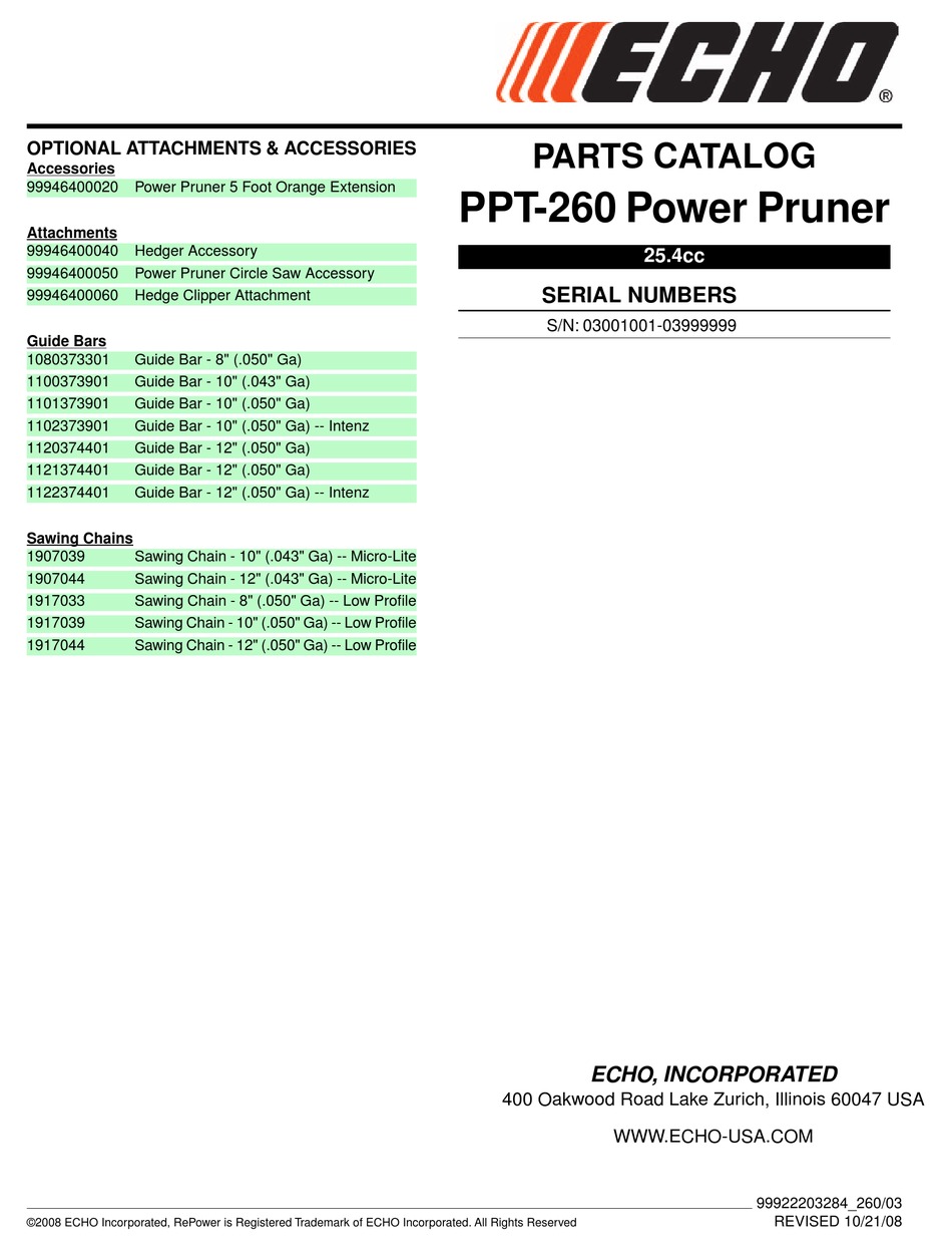 ECHO PPT260 PARTS CATALOG SERIAL NUMBER 0300100103999999 PARTS