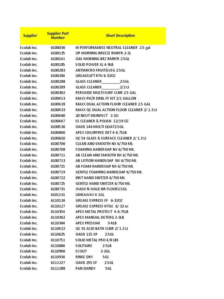Ecolab Supplier Part Numbers and Descriptions PDF Disinfectant